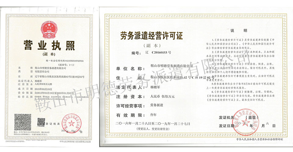 鞍山市明德勞務(wù)派遣有限公司于2013年由鞍山市工商局,鞍山市人力資源與社會保障局核準(zhǔn)成立,實(shí)繳注冊資金500萬元。